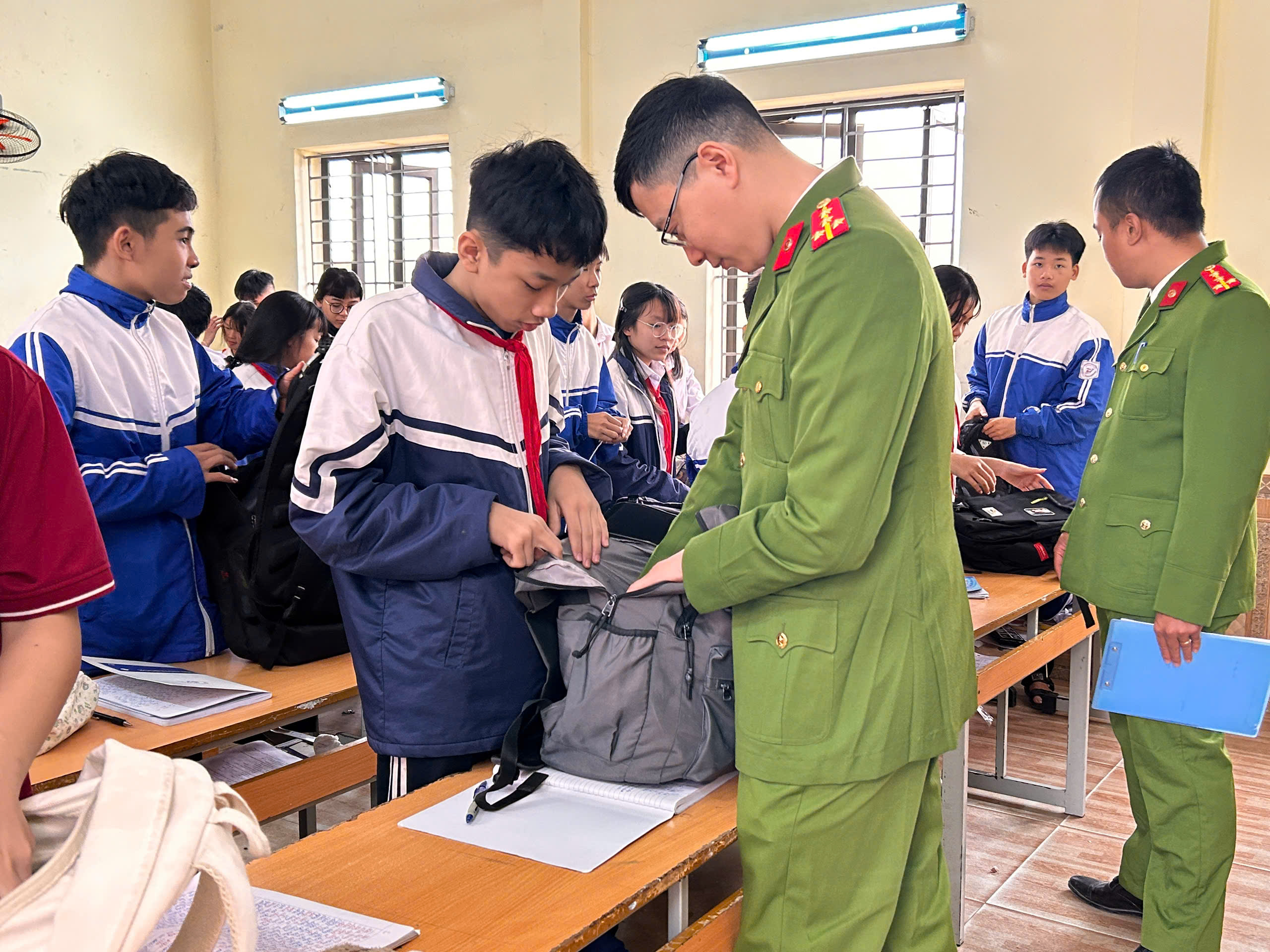 Trong quá trình kiểm tra, Công an xã kết hợp tuyên truyền pháp luật, yêu cầu học sinh tuân thủ nội quy, chỉ mang theo đồ dùng phục vụ học tập; không tự ý giải quyết mâu thuẫn bằng bạo lực mà báo cho giáo viên, nhà trường hoặc cơ quan công an để được hỗ trợ, xử lý kịp thời.