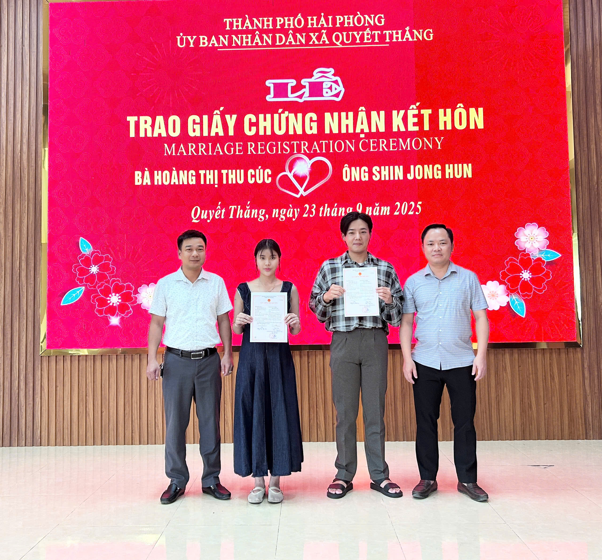 Sáng ngày 23/9/2025, tại Hội trường UBND xã Quyết Thắng đã diễn ra Lễ trao Giấy chứng nhận kết hôn cho chị Hoàng Thị Thu Cúc (thôn Trâm Khê, xã Quyết Thắng) và anh Shin Jong Hun (quốc tịch Hàn Quốc).